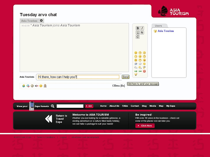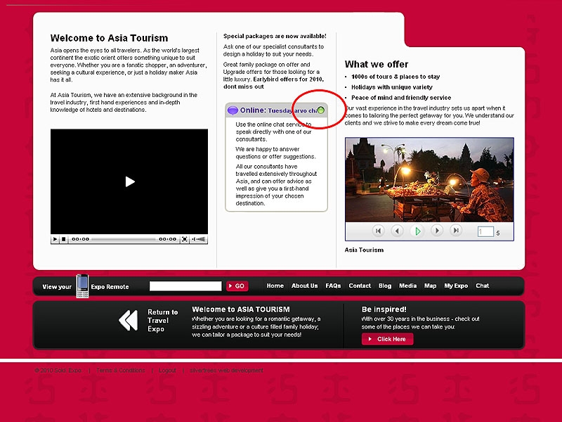 With Online Expos Live Chat feature, you can make yourself available to your clients and communicate with them from anywhere in the world! 24/7 access means you can set up chat sessions to run at anytime you wish. The multi-channel feature also means that you can run several sessions simultaneously, either single-handedly or a using a team to respond to visitor enquiries.
